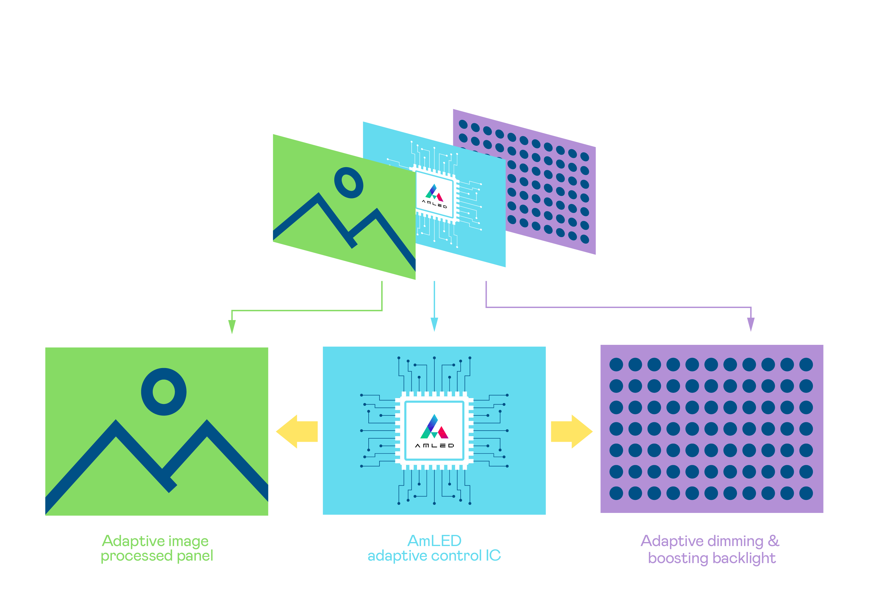 Low power consumption, low blue lightAmLED offers features such as higher power efficiency and low blue light. Compared to standard LED backlight display technologies, AmLED is regularly under local dimming status and consumes approximately 50% of the former's power; additionally, AmLED also features low blue light, satisfying the need for high standard specifications for eyecare.